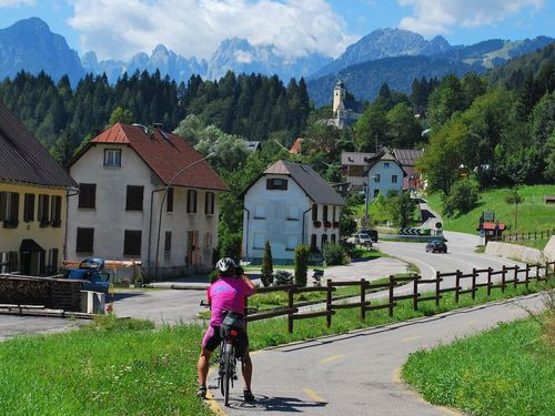 A definitive must for those who like stunning mountain scenery, but without the extreme physical exertion usually needed for such views. Not a "mountain bike tour" but suitable for cyclists of very average fitness, has one pass of 750 m / 2500 ft (but one has the whole day to do it on a quiet road or take an optional lift). This is a circular route starting and ending at the beautiful Lake Bled, which takes in some of the best that northern Slovenia has to offer.