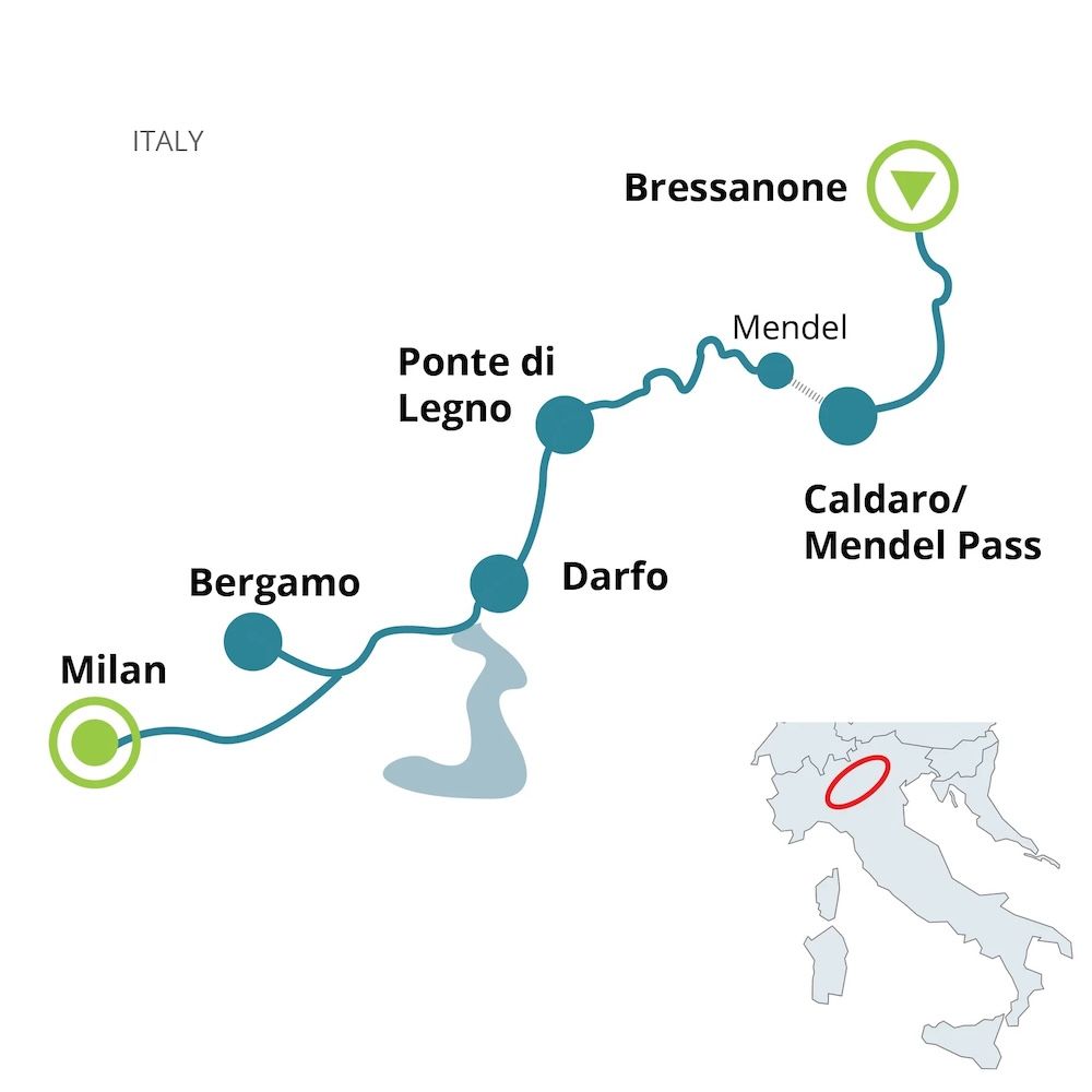 This unforgettable journey leads you from the lush green landscapes of South Tyrol to the vibrant heart of Italy’s financial capital: Milan. Pedal along scenic bike paths, peaceful country roads, and well-marked cycling routes as you discover a wealth of natural beauty and cultural treasures. Beginning in the charming town of Brixen, the journey winds through iconic Northern Italian destinations, culminating in the cosmopolitan allure of Milan.
